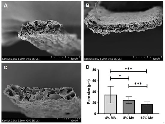 Scanning electron microscopy (SEM) images of MA-κ-CA hydrogel fiber (cross-sectional view). SEM images of cross-sectioned area of lyophilized MA-κ-CA fiber hydrogel formed by ionic and UV crosslinking (A) 4% MA-κ-CA, (B) 8% MA-κ-CA, (C) 12% MA-κ-CA. (D) Pore size according to substitution ratio of MA (* p < 0.05, *** p < 0.001).