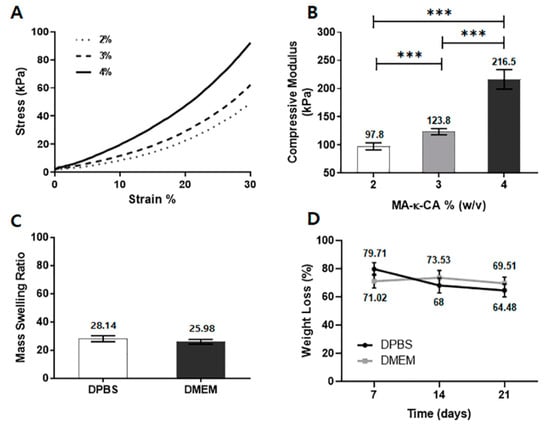 Mechanical properties, mass swelling ratio and degradation behavior of MA-κ-CA hydrogel. (A) Representative curves of 2%, 3% and 4% MA-κ-CA at 12% degree of methacrylation. (B) Young’s modulus of 2%, 3% and 4% (w/v) MA-κ-CA at 12% degree of methacrylation. (C) The mass swelling ratio of 3% (w/v) MA-κ-CA hydrogels in DPBS and DMEM. (D) Representation of weight loss percentage according to time of 3% MA-κ-CA hydrogels, immersed in DPBS and DMEM at 37 °C. (n = 3) ± standard deviation (*** p < 0.001).