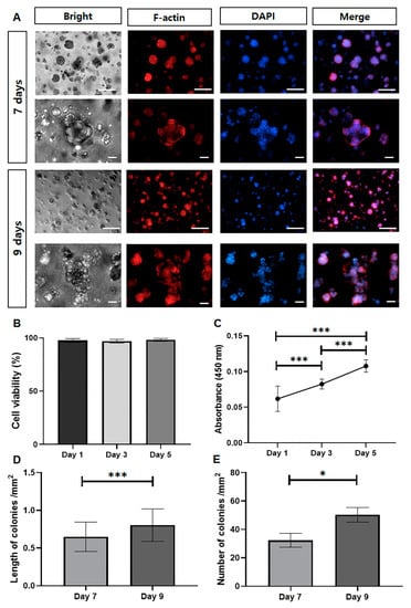 3D encapsulation in MA-κ-CA hydrogel assay. (A) DAPI/F-actin staining image at day 7 and 9. (Scale bar = x100; 200 μm, x200; 100 μm). (B) Cell viability assay and (C) CCK8 assay at day 1, 3 and 5. (D) Length of colonies and (E) Number of colonies at day 7 and 9 (* p < 0.05, *** p < 0.001).