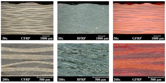 A total of 20 plies of carbon fiber (CFRP), 15 plies of basalt fiber (BFRP) and 14 plies of glass fiber (GFRP) fabrics were used in a 0° configuration for the 1-step vacuum infusion with BF-a, respectively, in order to obtain composites with similar thicknesses. All FRPs exhibited thicknesses in a similar range of about 3.9–4.2 mm. The CFRP exhibited a fiber volume content (FVC) of around 60 vol%, whereas the BFRP and GFRP exhibited slightly lower ones of roughly 57 vol% and 54 vol%, respectively. The BFRP and GFRP composites exhibited the highest density of 1.9 g/cm3, while the CFRP had the lowest density of 1.5 g/cm3 (Table A1). Microscopic images of cross-sections displayed a homogeneous morphology with well-penetrated fibers and near-zero porosity for all FRPs (Figure 1).