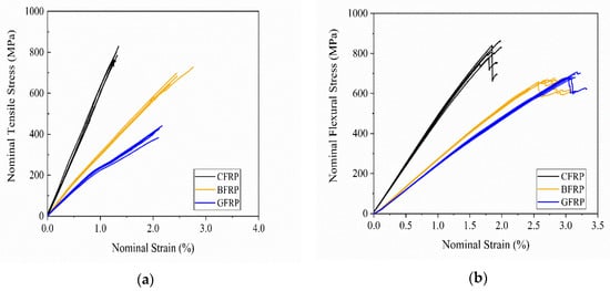 The impacts of the type of fiber reinforcement on the quasi-static tensile, flexural and interlaminar mechanical properties were determined by measuring the fiber-dominated and fiber-matrix-interface-dominated properties. Figure 2 depicts the nominal stress-strain curves of the quasi-static tensile (a) and flexural (b) testing.