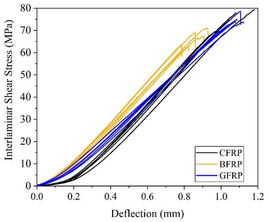 The CFRP exhibited the highest tensile and flexural modulus and strength, whereas the BFRP and GFRP exhibited the highest strain at failure (Table A2). This is in accordance with the mechanical properties of the neat fiber reinforcement as carbon fibers are known for their high strength and stiffness, whereas fibers from glass or basalt exhibit high elongation at break. FRPs’ tensile and flexural mechanical properties are fiber-dominated properties, whereas the apparent interlaminar shear strength (ILSS) display fiber-matrix-interface-dominated properties. Figure 3 presents the interlaminar shear stress—deflection curves.