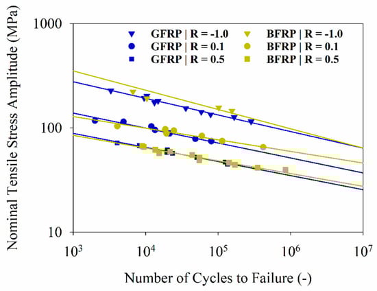 Due to the large number of samples and lengthy testing time, the fatigue characterization was limited to BFRP and GFRP with similar FVCs and numbers of plies. Stress amplitudes were determined to capture lifetimes (Nf) from the low to high cycle range (103 < Nf < 106). The experimental fatigue data points were fitted using Basquin’s law []. The S–N curves are shown in a double-log chart with a 50% probability of failure (Figure 4).