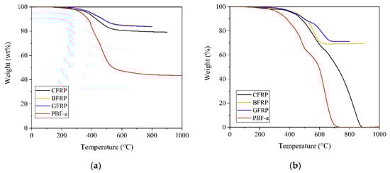 Thermogravimetric analysis was conducted on the neat polymer and on the FRPs using inert and ambient atmospheres to study the influence of the type of fiber reinforcement on the thermal and thermal-oxidative decomposition, respectively. The weight-temperature curves of PBF-a and FRPs under (a) nitrogen and (b) ambient atmospheres are depicted in Figure 5, and the decomposition temperatures at 2 and 10% mass loss (T2% and T10%) and the char yield at 800 °C are summarized in Table A4.