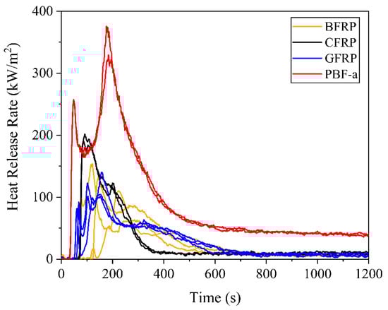 All FRPs showed a typical reaction-to-fire behavior of charring materials [] as the heat release rate (HRR) time curves displayed one peak after roughly 50–250 s, followed by a maximum peak (PHRR) and a decrease in the HRR until the end of the test. The peak can be attributed to the ignition of combustible pyrolysis gases that were released due to the thermal decomposition of PBF-a. Throughout the test, the amount of non-combustible residues increased, which led to a decrease of both gas transfer from the pyrolysis zone to the surface and heat transfer from the surface to the pyrolysis zone. Thus, the HRR converged to a comparably low point below 15 kW/m2 after roughly 400 s for CFRP and 700 s for BFRP and GFRP. Neat PBF-a showed two peaks in the HRR time curves, an earlier ignition (TTI) and higher PHRRs, as well as a convergency to a comparably high HRR of 50 kW/m2 after 600 s.