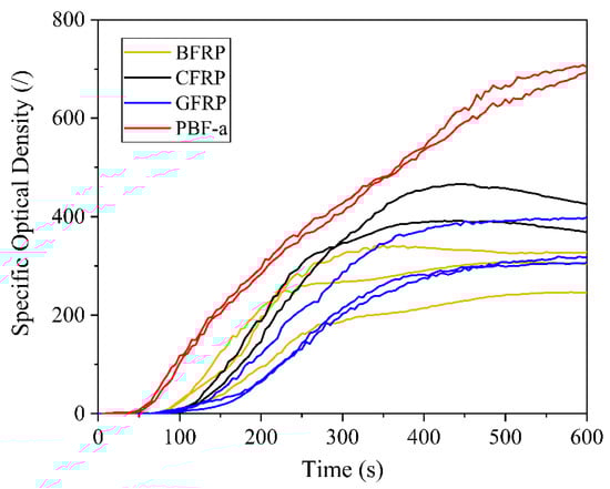 The addition of carbon, basalt and glass fiber reinforcement to PBF-a provided a substantial decrease in the smoke density properties. The improvements can be attributed to the reduced PBF-a content and the presence of non-combustible fibers. In view of that, the different types of fibers themselves impacted the smoke density properties. CFRP emitted a greater amount of smoke gases with a higher optical density than BFRP (decreased by 16%) or GFRP (decreased by 45%) at 240 s (Ds(4)). Additionally, CFRP exhibited a higher Ds,max value compared to BFRP and GFRP. VOF4 represents the specific optical smoke density over the first 4 min of the test. In view of that, GFRP exhibited lower smoke emissions when compared to BFRP and CFRP. Mineral fiber reinforced PBF-a exhibited lower smoke emissions compared to CFRP, substantially improving the smoke density properties of PBF-a.