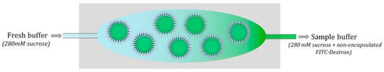 Top-down schematic for buffer exchange procedure. Buffer exchange is required for removal of non-encapsulated aqueous molecules. Fluorescein isothiocyanate-dextran (FITC-dextran) is included in the hydration buffer for encapsulation within the polymersome core. Excess FITC-dextran which remains in the buffer must be removed in order to facilitate imaging of the polymersome core.
