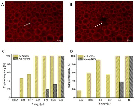 To further investigate the effect of AuNP encapsulation within the hydrophobic membrane of the polymersome, Figure 3C shows the rupture frequency as a function of pulse energy for both populations of vesicles with and without AuNPs. No fewer than 20 similarly sized vesicles were irradiated at each energy and only vesicles with no more than one contact point with another vesicle were chosen for this study. Vesicles selected for irradiation had an average diameter of 45.2 6.8 µm. As shown in Figure 3C, pulse energy required to induce observable rupture for vesicles containing AuNPs with fs-irradiation was 0.21 µJ, thus indicating a rupture threshold in the 0.057–0.21 µJ range. The energy required to observe rupture in vesicles w/o AuNPs is interpolated to be 5x higher at 0.73 µJ. Thus, vesicles with AuNPs present in the membrane displayed significantly greater photosensitivity under fs irradiation.