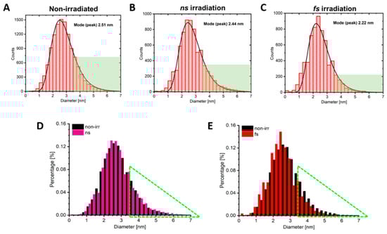 AuNP size distributions following vesicle irradiation. (A–C) The diameters of AuNP populations within polymersome membranes were measured without irradiation, and after ns and fs irradiation, respectively. The green shaded area highlights NPs with diameters greater than 3.5 nm. (D,E) Comparative population overlays for irradiated vs. non-irradiated samples. The green triangle highlights the size region of interest where particle fragmentation is apparent.