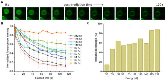 Encapsulant release as a function of time from Polymersomes loaded with 0.04% (w/v) AuNPs. (A) A sample time series displaying a decrease in fluorescence intensity as a function of time as FITC-dextran diffuses out of the vesicle after the delivery of a single 212 nJ pulse. (B) The fluorescence intensity inside of an individual vesicle is measured as a function of time following a single 532 nm, fs pulse at the indicated energy. Each line represents the fluorescence decay in a region of interest (ROI) (3–4 replicates +/− standard error of the mean (SEM)). (C) Total encapsulant release after 120 s at the indicated pulse energy.
