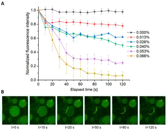To investigate the effect of AuNP concentration on polymersome photo-response, vesicles with varying amounts of AuNPs loaded in the membrane were prepared. Polymersome samples with no AuNPs, 0.013%, 0.026%, 0.040%, 0.053%, and 0.066% (w/v) AuNPs were subjected to a single, 144 nJ fs pulse (chosen as a mid-range poration energy) and the subsequent cargo diffusion rate and total release were quantified for each sample. A distinct difference in the amount of fluorophore released from a minimally loaded sample with 0.013% AuNPs compared to a maximally loaded sample with 0.066% AuNPs could be observed, and is displayed in Figure 6A. In the case of the minimally loaded sample, there is negligible change in the fluorescence intensity in the vesicle core. However, in the case of the maximally loaded sample, a significant amount of the fluorophore diffused from the vesicle after two minutes. Using identical methods as those used to acquire data in Figure 5B, Figure 6A displays normalized fluorescence intensity as a function of time for a minimum of three vesicles at six distinct AuNP concentrations. Encapsulant release ranges from 90–100% (in the case of 0.066% (w/v) AuNPs) to 0% (in the case of 0% w/v AuNPs), scaling with AuNP concentrations.