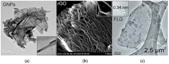 Electronic micrographs of the graphenic nanomaterials used: (a) GNPs (graphene nanoplatelets); (b) rGO (reduced graphene oxide); (c) FLG (pristine few-layer graphene). Enlargements inserted in the corresponding pictures show the number of layers and the distance between crystalline planes.