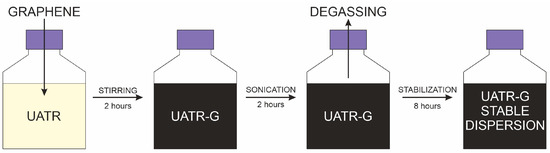 The graphene-doped UATR/aramid nanocomposites were prepared at room temperature, following a similar procedure to that described in previous works [3,13,14]. Graphenic nanomaterials were added to the liquid UATR matrix (2% w/w) and mechanically stirred at 800 rpm for 2 h in a screw-top flask. Graphene-doped UATR (UATR-G) was then sonicated in an ultrasonic bath (50–60 Hz) for 2 h, with the cap opened every 30 min to allow degassing, in order to prevent the formation of air bubbles in the final laminate. Once the sonification process was completed, the UATR-G dispersion was left overnight for colloidal stabilization and protected from sunlight, to prevent degradation of the polymer matrix caused by undesired photochemical reactions. No coupling or dispersing agent was used in the preparation of the matrices so as not to alter the chemistry of the UATR polymer or the possible interactions of the graphenic nanomaterials among themselves (self-aggregation) or with the rest of the components of the final nanocomposite. To ensure the homogeneity of the laminates, the matrix used for the undoped laminate was subjected to the same procedure as the UATR-Gs but without the addition of any doping agent. Figure 2 provides a schematic representation of the preparation process for the UATR-G matrices.