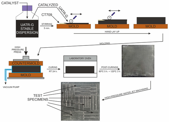 The catalyst (Trigonox 239, Cumyl hydroperoxide) was added to the stabilized UATR-G colloidal dispersion (2% w/w) with mechanical stirring at 250 rpm for 5 min. Laminates, reinforced with Twaron CT709 para-aramid fibers, were made by means of a combined technique of hand lay-up and vacuum-assisted molding under compression at room temperature. Once the lamination process was completed, the laminates were cured for 24 h at room temperature, followed by two post-curing steps at 80 °C (5 h) and 120 °C (3 h), according to the manufacturer’s technical specifications. After curing, the corresponding specimens were machined from the laminated plates by high-pressure water jet cutting, for the characterization of their mechanical properties. Figure 3 shows a schematic representation of the manufacturing process.