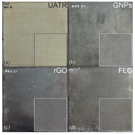 (a) Undoped UATR/Aramid composite laminate; (b) UATR-GNPs/Aramid nanocomposite laminate; (c) UATR-rGO/Aramid nanocomposite laminate; (d) UATR-FLG/Aramid nanocomposite laminate. Magnifications (×4) are inserted as a smaller square in each picture.