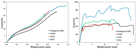 Figure 5 shows the force–displacement curves for the tensile and flexural tests carried out.