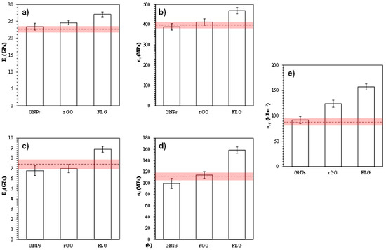The excellent mechanical properties of pristine graphene, together with its bidimensional morphology and large specific surface area, make it a very effective nanoreinforcement, since it can transfer part of its mechanical properties to the matrix and distribute the stresses to which it is subjected. This increases the capacity of the nanocomposite to withstand local stresses and drastically reduces stress concentrations within the matrix, which results in a significant increase in the mechanical properties of the nanocomposite [24,25,26,27].