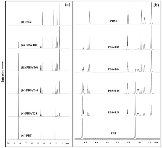 NMR data of the synthesized PBSe, PBT and the PBSeT copolymers with various sebacic acid/dimethyl terephthalate ratios. (a) Whole spectra and (b) magnification of chemical shift (1.0 ~ 5.0 ppm).