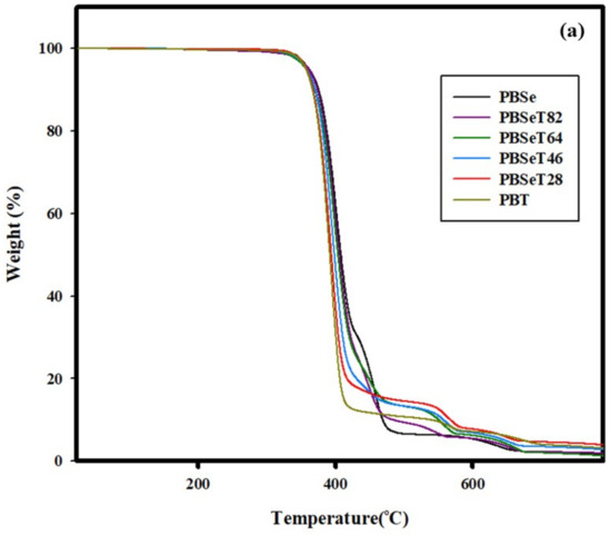 For PBSe, the onset temperature of thermal degradation was 377 °C with a primary thermal degradation weight loss of 66.4% at T1 (401.8 °C); it showed three major decomposition peaks in DGTA analysis. In comparison, PBT showed a thermal degradation onset temperature of 371.0 °C and a primary degradation weight loss of 86.0% at T1 (393.7 °C). The weight loss during the first thermal degradation for the polymers containing 20%, 40%, 60% and 80% of DMT were higher than that of the 0% DMT polymer (i.e., PBSe) at 86.6%, 84.9%, 85.1% and 80.4%, respectively. All the synthesized PBSeT samples showed a lower temperature of primary degradation than PBSe; however, it decreased slightly with increasing DMT ratio. However, a new peak appeared near 560 °C in the 20%, 40% and 60% DMT samples. This was attributed to the effect of the –COO ester functional group [47]. However, in the case of 80% DMT, this new peak was not observed due to the strong effect of the high terephthalate content. PBSe exhibited a residual weight of 2.5% at 663 °C and that of the PBSeT polymers ranged from approximately 1–4% with increasing DMT content. For PBT, a residual weight of 4% was observed at 697 °C.