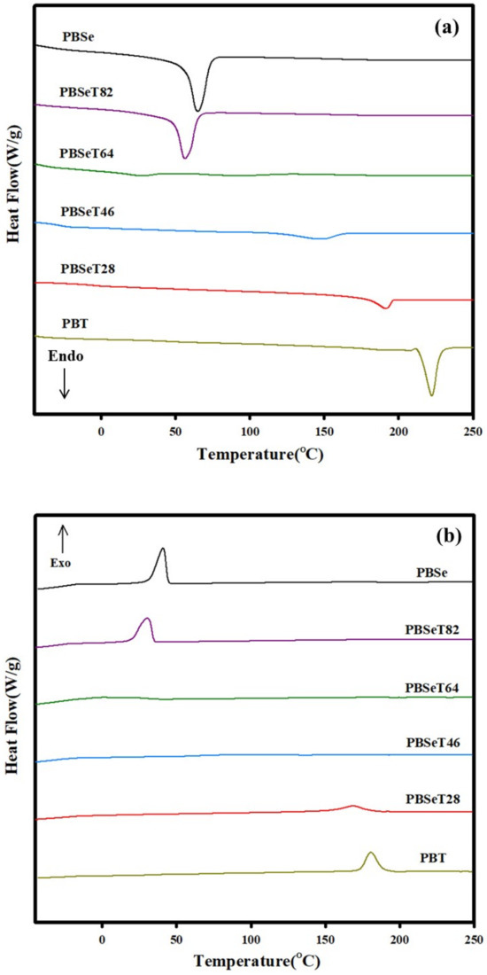 DSC analysis of the synthesized samples revealed large differences among the melting temperatures of PBSe, PBT and PBSeT with various dimethyl terephthalate ratios (Figure 7 and Table 5). PBSe exhibited a melting point of 65.3 °C and the melting temperature decreased as the DMT content was increased to 20% and 40%, as shown in Figure 7. In particular, when the content of DMT was increased to 40%, melting point was observed at 29.3 and 93.3 °C; however, the ΔHf were very low as 1.9 J/g and 6.3 J/g, respectively. Similarly, as the content of DMT increased to 40%, the ΔHc signals were also remarkably getting weaker compared to the ΔHc enthalpies of other samples. The decreased crystallinity and weak peak intensity of Tm of PBSeT64 could be explained in terms of a change from a semicrystalline to an amorphous phase state, that is, an increase in the amorphous phase in the domain.