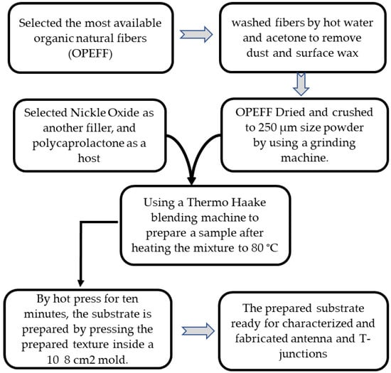 The composite was then preheated for 10 min with an upper and lower plate temperature of 80 °C as a breathing time of two minutes was allowed for the release of bubbles and to reduce void; the composites were then pressed at a pressure of 110 kPa at the same temperature for another 10 min. Finally, the prepared substrate was left to cool to room temperature (27 ℃). The substrate ready for testing as well as for the preparation of (microstrip antenna, and T-junction) for microwave applications. The substrate preparation steps were presented in detail in Figure 1.
