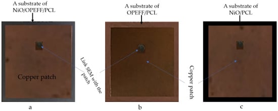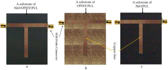 The fabricated antennas NiO/OPEFF/PCL, OPEFF/PCL, and NiO/PCL are presented in Figure 2a–c. The coaxial connector SMA inner conductor extends via the dielectric and connected to the radiating patch by soldering. While to the ground plane, connection is made with the outer conductor. The main advantage of this type of feeding system is that the alimentation can be placed at any desired position inside the patch in order to match with its input impedance. This feed method is easy to fabricate and has low spurious radiation. The other antenna’s structural dimensions are listed in Table 2.