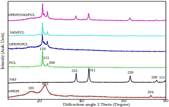 XRD patterns for pure material under test and OPEFF/NiO/PCL composites at different compositions.