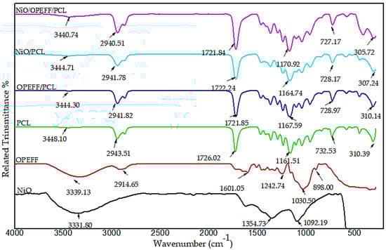 The technique of FT-IR was employed in this study to demonstrate the bonding, interaction, and monitor the shifts in absorption peaks in specific IR regions for the determination of the known interactions of the functional group of the PCL with NiO and OPEFF. Figure 5 presents the FT-IR spectra of pure material and the OPEFF/PCL, NiO/PCL and OPEFF/NiO/PCL composites with many regions of specific stretching at room temperature. FT-IR spectra of OPEFF/PCL which reveal the distinct broad peak of hydroxyl group absorption at around 3448–3440 cm−1. The O–H stretching vibration of cellulose, lignin component of OPEFF, hemicelluloses and absorbed water are responsible for this. The stretching vibration C–H in polycaprolactone could explain the presence of the peak around 2941.82 cm−1. The peak of absorption at around 1721 cm−1 and the peak around 1600 cm−1 resulting from water absorption by cellulose is an indication of the presence of carbonyl groups in lignin and hemicelluloses of OPEFF. The bending of –CH2 and –CH3 in all FT-IR spectra is indicated by the peak around 1454–1442 cm−1 []. C–O stretching of aliphatic secondary and primary alcohols in fiber is indicated by the absorption band in the region of 1167.59–1154 cm−1 in OPEFF spectrum []. An interaction between the PCL and fiber is being revealed by the absence of substantial changes in the peaks’ position. The significant peaks of OPEFF fiber was not spotted in the fiber-reinforced PCL composites because they may have been enveloped by other strong peaks of PCL, given that the magnitude of fiber was less compared to that of the PCL matrix []. The presence of these peaks at 1154–1167.59 cm−1 indicated that the fiber had been introduced into the polymer matrix. Nickel oxide (NiO) was used to reinforce the OPEFF/PCL composites. Figure 6 shows the spectra of 25 wt. % fiber-reinforced at 50 wt. % PCL with 25 wt. % NiO. There was a shift of broadband (~3444.30–3440.74 cm−1) to the left which corresponds to the OH stretching. This phenomenon occurred because of the existence of hetero-associated hydrogen bonds that formed between the carboxylic acid groups of PCLs and the NiO bonded group. Hydrogen bonding was the only interfacial force that facilitated the interconnection between the PCL matrix and the NiO reinforcement network.