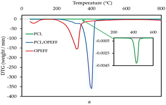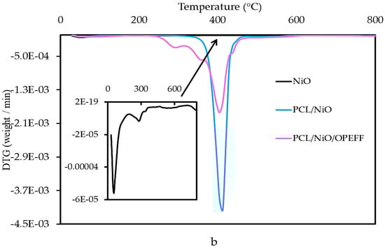 Derivative thermogravimetric (DTG) thermograms of (a) neat PCL, neat OPEFF, and PCL/OPEFF composite, and (b) Neat NiO, PCL/NiO, and PCL/NiO/OPEFF composite.