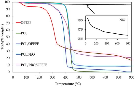 Thermogravimetric analysis (TGA) thermograms of neat PCL, neat OPEFF, neat NiO, PCL/OPEFF, PCL/NiO, PLA/NiO/OPEFF composites.