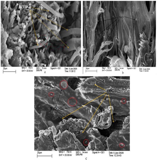 Scanning electron microscopy was used to study the surface morphology of the 12.2 wt. % OPEFF/87.8 wt. % PCL, 12.2 wt. % NiO/87.8 wt. % PCL, and 25 wt. % OPEFF/25 wt. % NiO/50 wt. % PCL composites. SEM Morphological images with 750× magnification shows of the cross-section for all composites are shown in Figure 8a–c. It appears that their dispersion of fiber and nickel oxide could be seen inside the matrix. Figure 8a illustrates a scanning electron micrograph of the 12.2 wt. % OPEFF/87.8 wt. % PCL surface showing the fiber surfaces are shown clean which indicated poor adhesion between the fibers and the PCL matrix. The micrographs reveal that the fibers are oriented in the form of single fibers, hence implying that the fibers have been dispersed during the blending process []. Good dispersion of single fibers and good fiber orientation shall contribute to producing good mechanical properties and thus result in good tensile strength for this biocomposites material []. Figure 8b with 750× magnification shows NiO particles were well distributed in the PCL polymer matrix indicating the presence interaction between the NiO particles and the PCL matrix. Figure 8c illustrates a scanning electron micrograph of the surface for 25 wt. % OPEFF/25 wt. % NiO/50 wt. % PCL composites. At first sight, the dispersion of NiO particles and OPEFF in the PCL matrix by the efficient mixing of NiO particles and OPEFF in the matrix via Thermo Haake blending machine. It is observed that the NiO particles in composites were randomly arranged with OPEFF in the PCL matrix, the composite showed some gaps and good interfacial.