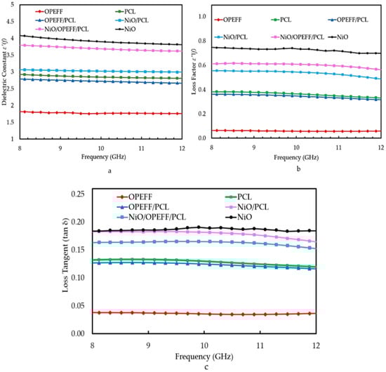 The OPEFF has a lower dielectric constant and loss factor than PCL as shown in Figure 9a,b. Thus, the increment of the percentage of OPEFF would weaken the polarizability strength of OPEFF/PCL composites, which in turn would reduce both the dielectric constant and loss factor . However, the measured and for nickel oxide and nickel oxide composites are rather high as compared to OPEFF, PCL, and OPEFF/PCL substrate composite. Accordingly, the measurement results showed that polymer-fiber, nickel oxide composites exhibit controllable permittivity dielectric constant between 1.89 and 4.2 F/m, with loss factor between 0.08 and 0.62 F/m, and loss tangent (tan δ) between 0.05 and 0.18 depending on the mixing ratio of filler powders to the polymer matrix as shown in Figure 9c.