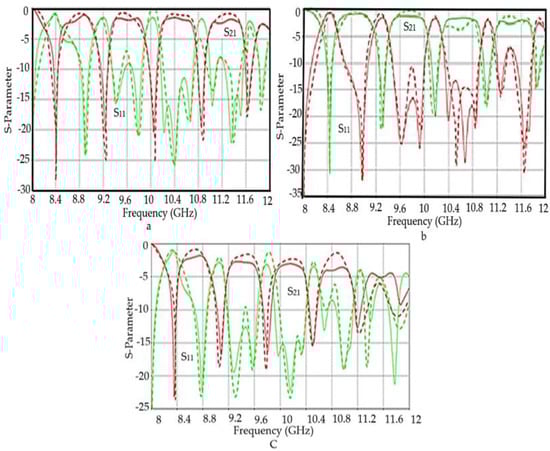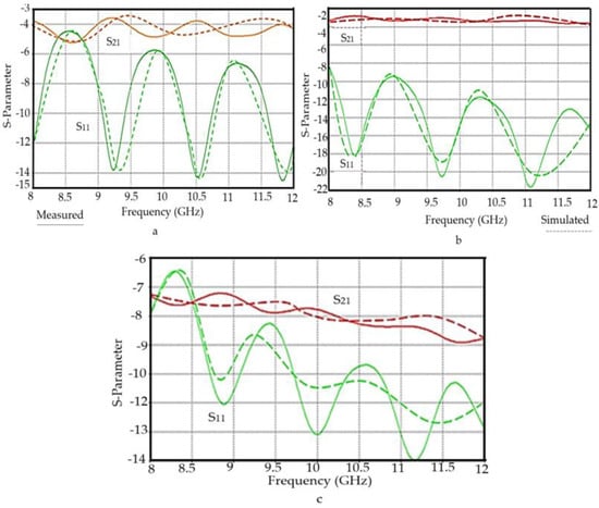 The reflection coefficient (S11) and transmission coefficient (S21) values’ variation with frequency for various substrates that have been prepared from composites of polymer placed at rectangular waveguide as well as simulation results are presented in Figure 10a–c. The X-axis is a representation of the frequency from 8–12 GHz, while the Y-axis represents a magnitude S11 and S21 at dB. The two main curves in the diagrams represents the reflection coefficient (S11) and transmission coefficient (S21) and the sum of curve values, which is near unity. An acceptable agreement can be seen from the results. Also, the fabricated substrates were used to mount T-junctions to test their S-parameters. As seen in Figure 11a–c, the simulated results show an excellent agreement with the measured results