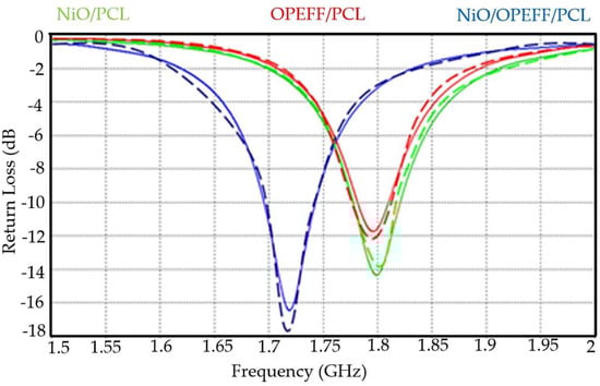 The change in substrate content of composites composition (wt. %) in the patch antennas drops the resonant frequency (fo) to lower frequencies in both experimental and simulated values of return loss for all patch antennas, as shown in Figure 12. This was resulted from a consequential NiO and OPEFF increase which changes the dielectric constant of the substrate. The observed results are an indication of possibility of developing an antenna that can operates in 1.7–1.85 GHz frequency range, controlling only the resonator composition. Therefore, fo and εr, depend on the kind of material and percentage of filler concentration in the composite []. The maximum RL value for NiO/OPEFB/PCL sample reaches −16.3 dB at 1.724 GHz, while the RL value for the NiO/PCL sample was obtained reaches −14.2 dB at 1.80 GHz. In addition, the minimum RL value for OPEFB/PCL sample reaches -11.93 dB at 1.79 GHz. It is clear from the investigation that measured and simulated results are likely the same that means these antennas had not many losses while transmitting the signals and the error for all samples was acceptable and as if virtually non-existent, but some fabrication losses and environmental conditions slightly altered the results.