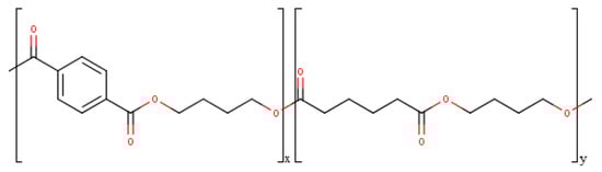According to the report of European Bioplastics (EUBP, Germany) and nova-Institut (Germany) “Bio-based Building Blocks and Polymers—Global Capacities, Production and Trends 2019–2024”, the world market for all types of polymers in 2019 amounted to 478 million tons, while the share of bioplastics produced was approximately 1%. According to experts, the world capacity for the production of biopolymers will reach about 2.43 million tons per year by 2024, which is 15.2% more compared to 2019 [8]. One of the widely known and promising bioplastics is polybutylene adipate terephthalate (PBAT). In the segment of biodegradable materials in 2019, the share of PBAT was 13.4%. According to experts from European Bioplastics (EUBP, Germany) and nova-Institut (Germany), production capacities for the production of bioplastics increased in 2018–2019 due to the expansion of the production of PBAT [8]. PBAT refers to aliphatic-aromatic copolyesters, produced as the result of polycondensation between 1,4-butanediol, adipic acid, and terephthalic acid [9]. The structure of the PBAT block copolymer is shown in Figure 1.