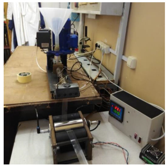 For obtaining polymer compositions in form of granules was used laboratory extruder with ultrasonic melt (22.4 kHz, the ultrasound power was 300 W) treatment with a screw diameter of 16 mm and a screw length of 400 mm; the screw speed—90 rpm (Figure 2).