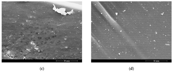 Micrographs of the surface structure of the samples of the materials PBAT (70,000×): (a) PBAT, obtained without ultrasonic treatment; (b) PBAT+BBE, obtained without ultrasonic treatment; (c) PBAT, obtained with ultrasonic treatment; (d) PBAT+BBE, obtained with ultrasonic treatment.
