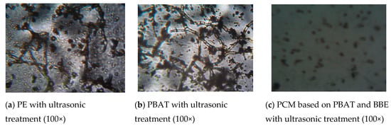 Additionally, the stability of PBAT + BBE materials obtained with the ultrasonic treatment of melts and exposure to high humidity (more than 90%) at 29 ± 1 °C was assessed against A. niger according to the degree of fungi development on the film surface under a microscope (Figure 5).