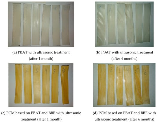 In contrast to PE [33], with the change in elongation at break after 4 months of composting is about 3–5%, in this work all PCM samples based on PBAT showed the change in this criterion for assessing biodegradability by more than 50%. This confirms the data that materials based on the studied biopolymer are biodegradable. It should be noted that the PCM samples, based on pure PBAT, showed the more noticeable change in elongation at break after composting, than PBAT samples with the antimicrobial additive. This indicates that the introduction of BBE into the biopolymer matrix slows down the decomposition of the studied materials in the environment, probably due to the fact that the antimicrobial additive prevents the development of microorganisms on the PCM surface and the biodegradation process proceeds due to the hydrolysis of the PBAT polymer matrix.