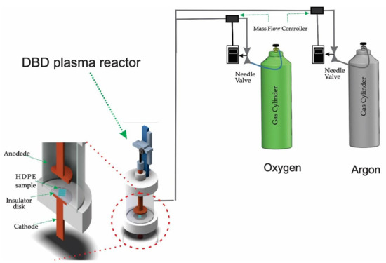 In the last decades, there was an increase in the number of technologies to superficial modification of materials that sought to increase hardness, wear resistance, adhesion strength, hydrophilicity, biocompatibility, among other materials’ properties [9,10,11,12]. Among these technologies, the treatment of plasma in dielectric barrier discharge (DBD) has been used to increase the surface energy of polymeric materials by incorporating polar groups on the surface without changing its mass composition [13,14,15,16,17]. The process occurs between two electrodes, where at least one of which must be covered by a dielectric [18,19,20]. An advantage over other plasma formation techniques is that DBD does not require low pressures, avoiding the use of vacuum systems and the use of high electrical currents, reducing energy consumption, and making it a low-cost process [21,22].