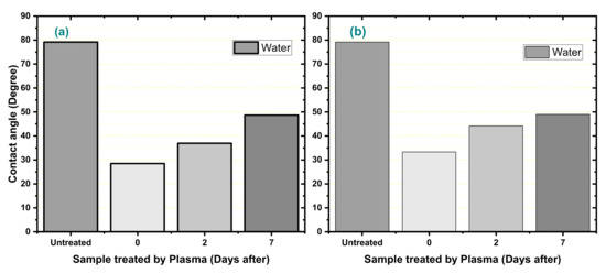 Values of the angles of water obtained before and after the treatment in (a) argon and (b) oxygen.