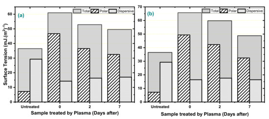 Based on the contact angles, the interfacial stresses were calculated by the Fowkes method. Thus, in Figure 5, the polar, dispersive, and total surface tension values of each treatment are presented. The surface tension values point to broken bonds such as C–C and emphasize the permanent character of the changes that occurred in the dispersive coordinates because, in seven days, there were no changes in the values of this surface tension coordinate. However, The increase in polar coordinates suggests the formation of oxygen bonds, C–O or C=O, as well their reduction with time suggests that these groups were, in some way, stabilized by reactions with the medium, as reported in the literature [3,9,16].