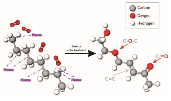 The energy values measured by this technique proved to be sufficient in altering the chemical bonds present in the HDPE chain, as shown in Table 2 [63]. It is thus possible to promote the breaking of surface bonds, as well as the incorporation of species, resulting in new functional groups.