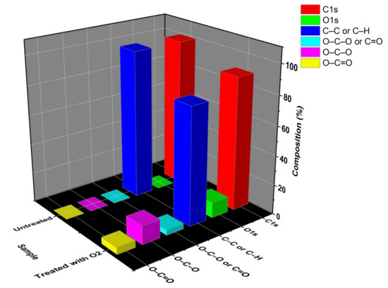 Several attempts have been reported in the literature using DBD plasma to improve the wettability of polymeric surfaces, since it does not deteriorate and can modify the treated surface [17,23,25,26,27]. The authors justify that the increase in wettability in polymeric materials is directly associated with the incorporation of functional groups such as C–O, C=O, and O–C–O [11,28,29,30,31]. The incorporated functional groups were verified, by the authors, using the XPS or FTIR techniques, with the associated reduction of the peak of the C–C and C–H bonds [5,12,32]. These modifications have been made in polymers such as: polypropylene [11,31], polyethylene [3,12,32,33], poly (lactic acid) [4,34], polyester [9,26,35], and others [10,29,36,37,38,39,40].