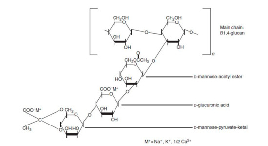 Chemical structure of XG showing both D-Mannose and D-glucuronic acid units linked to the backbone of the glucose, while (M+) is the cation binding sites. Reprinted from [24]. Copyright @Elsevier 2012