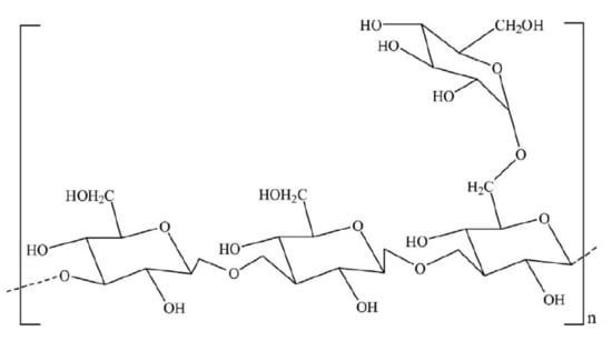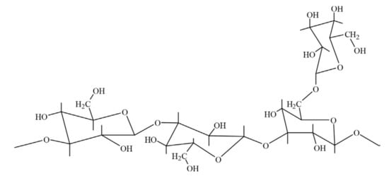 This type of biopolymer is produced by a fermentation process involving a plant pathogen fungus of the genus Sclerotium. Some authors have pointed out that other biopolymers of fungal origin do exist [36] but that potential application in recent times has been based on antitumor effects alluding to the glucan family as well as their effectiveness in pharmaceutical industries. Scleroglucan is a rod-like biopolymer with a triple-helical structure. In terms of rigidity, the helical structure exhibited by scleroglucan leads it to behave as a semirigid molecule in an aqueous solution. These repeating structures are linked (linearly) via , glucose residues, where the side chain is usually attached to every third main chain residue with , glucose on the backbone (see Figure 5) [15].