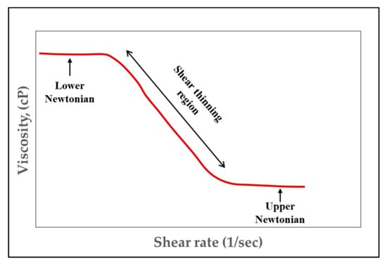 Fluids can be either divided into Newtonian or non-Newtonian fluids. A Newtonian fluid has a linear relationship between shear rate and shear stress, whereas non-Newtonian fluids have a nonlinear relationship between shear rate and shear stress. HPAM and XG polymers used in EOR applications are non-Newtonian fluids [11]. Polymers used in EOR usually have shear-thinning rheological properties. In rheology study, shear-thinning is sometimes considered synonymous to pseudoplastic behaviour of fluid because it is a property which describes fluid behavior when subjected to applied stress. This means that the apparent (when considering different composition) viscosity of the polymer solution decreases when the shear rate is increased, as shown in Figure 7. The reason for this occurrence is due to polymer molecules arranging themselves within the shear rate field where internal friction is reduced [2]. In addition to this, at a low shear rate value, the polymer solution in Figure 7 exhibits a homogeneous sequence (lower Newtonian), whereas when shear increases, the polymer’s apparent viscosity decreases, giving rise to a power law. This region (shear thinning), which obeys the power-law index, is expressed using the Ostwald de Waele model, as shown in Equation (3). A continuous increase of shear rate makes the polymer solution, again, behave as a Newtonian fluid (upper Newtonian).