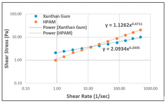 The shear rate vs. shear stress of HPAM and XG. Reprinted and modified from [57].