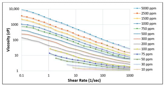 Effect of shear rate on the viscosity of HPAM solution at various concentrations [58].