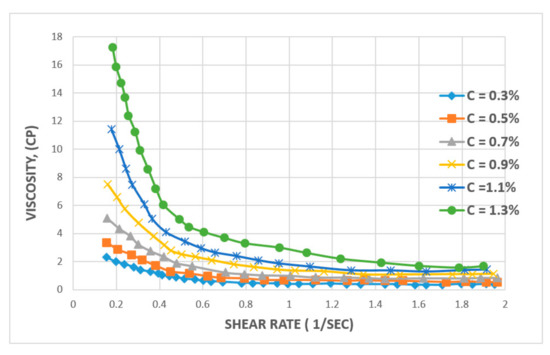 Similarly, when the effect of concentration is analyzed for the XG biopolymer, Ghoumrassi-Barr and Aliouche [35] have reported that increasing the concentration of xanthan leads to a slight initial increase in shear rate and a drastic impact on the viscosity of solution (See Figure 12). However, after increasing the shear rate to 0.8 sec−1, the viscosity of the solution stabilizes and remains as high as 2.0 cP. Contrastingly, in the case of HPAM, its viscosity continues to decrease steadily and steeply with increasing shear rate, where xanthan shows better stability against shear rate for polymer viscosity versus shear rate behaviour.